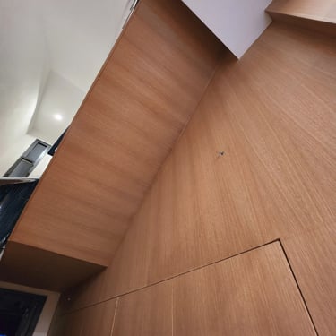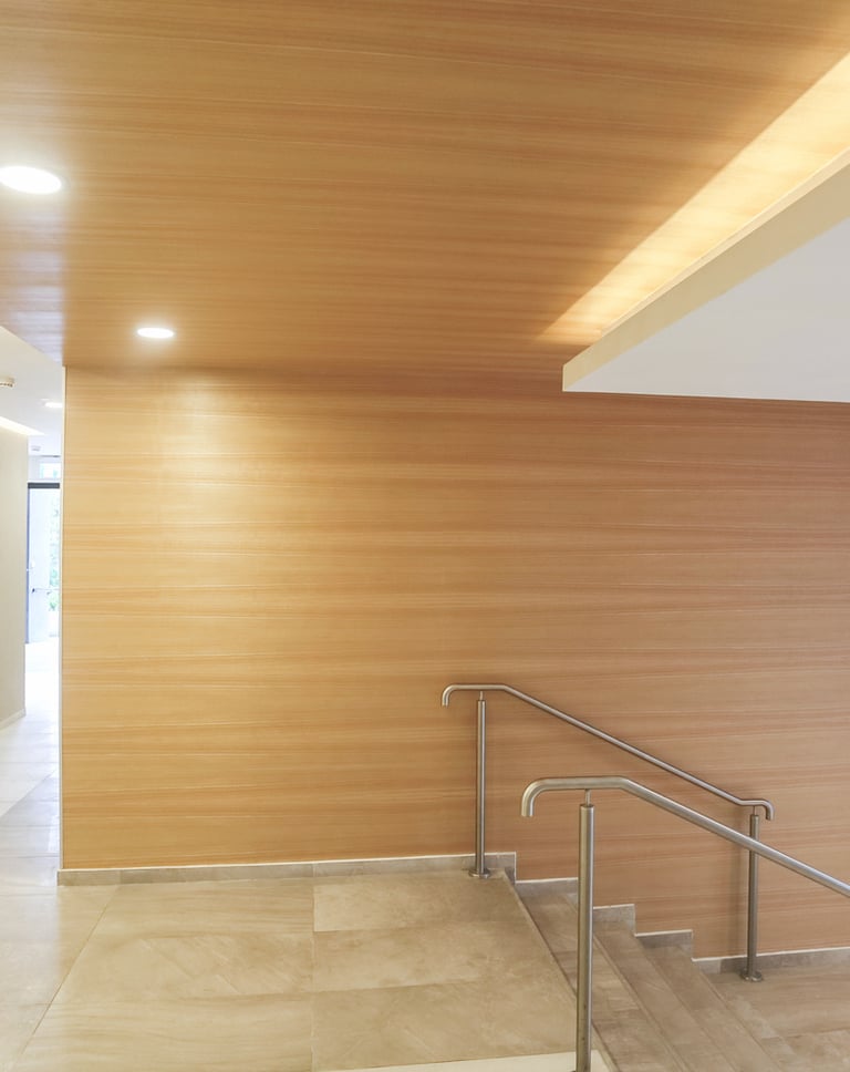חיפוי ישירות ע"ג קרמיקה עם מערכת אריחי אלומיניום בחיפוי פורניר עץ טבעי (אלון) ההתקנה ללא חיבורים נראים.